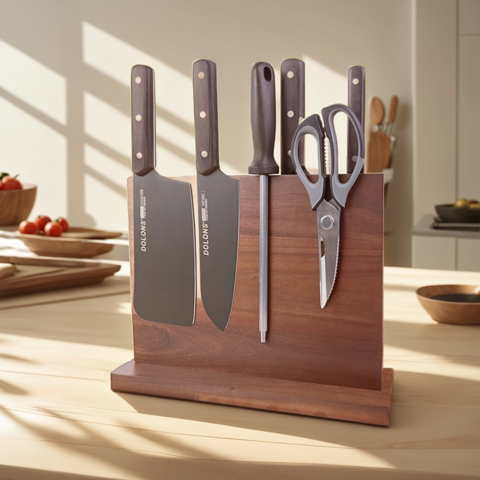 The magnetic knife block isn’t just a practical accessory; it’s a statement piece. The Dolons set’s dark walnut wood harmonizes well with any kitchen style, from modern minimalist to rustic charm. This magnetic block’s ability to securely hold the knives in place ensures that they remain safely stored, yet immediately within reach for use. The elegant design doesn’t compromise on functionality; rather, it enhances it by ensuring your knives remain immobile until needed. This stability and modern elegance make the knife block with magnet not only a practical addition but an essential one for any cook who values efficiency and grace in their culinary pursuit.