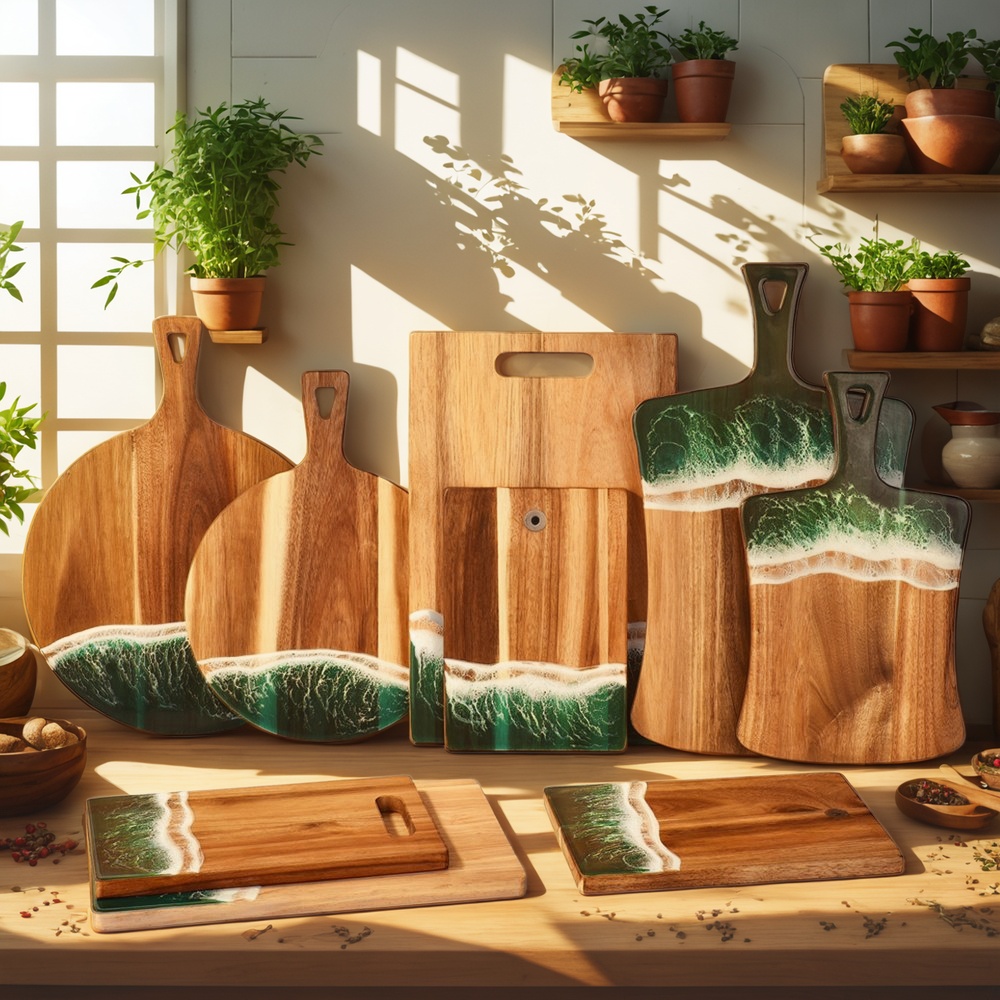 Resin cutting boards represent the pinnacle of innovation in kitchen accessories, blending both aesthetic appeal and exceptional functionality. The Ocean Wave Artisan Cutting Board Collection takes this concept to new heights, offering a unique synthesis of natural beauty and practical utility. Crafted from premium materials, these boards not only serve as essential kitchen tools but also as artistic displays that enhance any culinary space.